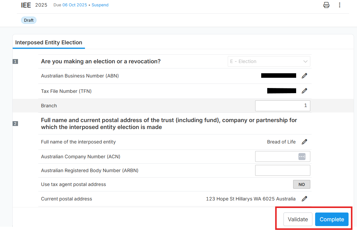 After filling the form, click "Validate" to check missing field or error, and select "Complete" if form is ready.