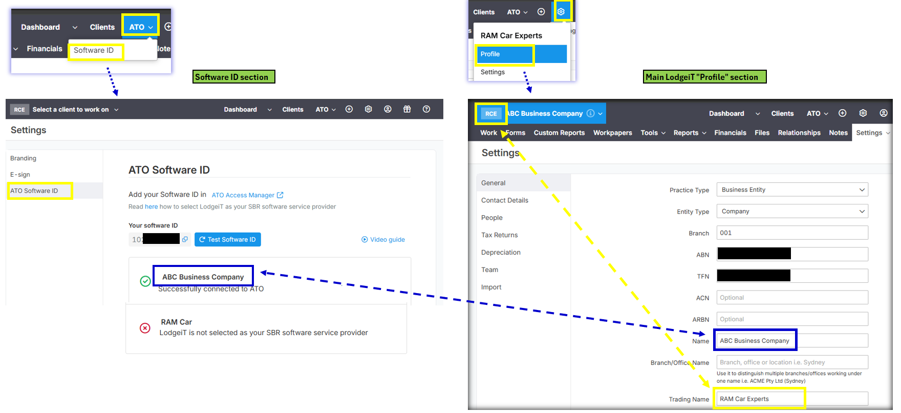 **Please note also that when you are checking the ATO (Software ID) connection of the main LodgeiT Profile, the "Name" field ("ABC Business Company" per example image below) in the main Profile settings is the name that will show in the ATO > Software ID section in LodgeiT (see left side part of the image below). Don't be confused with the Trading Name which will show as the initial in the left side of your dashboard (example below is a trading name of "Ram Car Experts" with initial of RCE). Please avoid also creating other client/s with the same or similar name to avoid confusion, if the correct entity (client) Software ID is already connected to ATO or not.