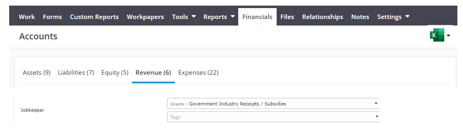 Classify "Jobkeeper" > "Grants"The income will reflect in the tax return as "Assessable government industry payments"Reference:ATO- Tax treatment of JobKeeper PaymentsATO - Jobkeeper payment for company