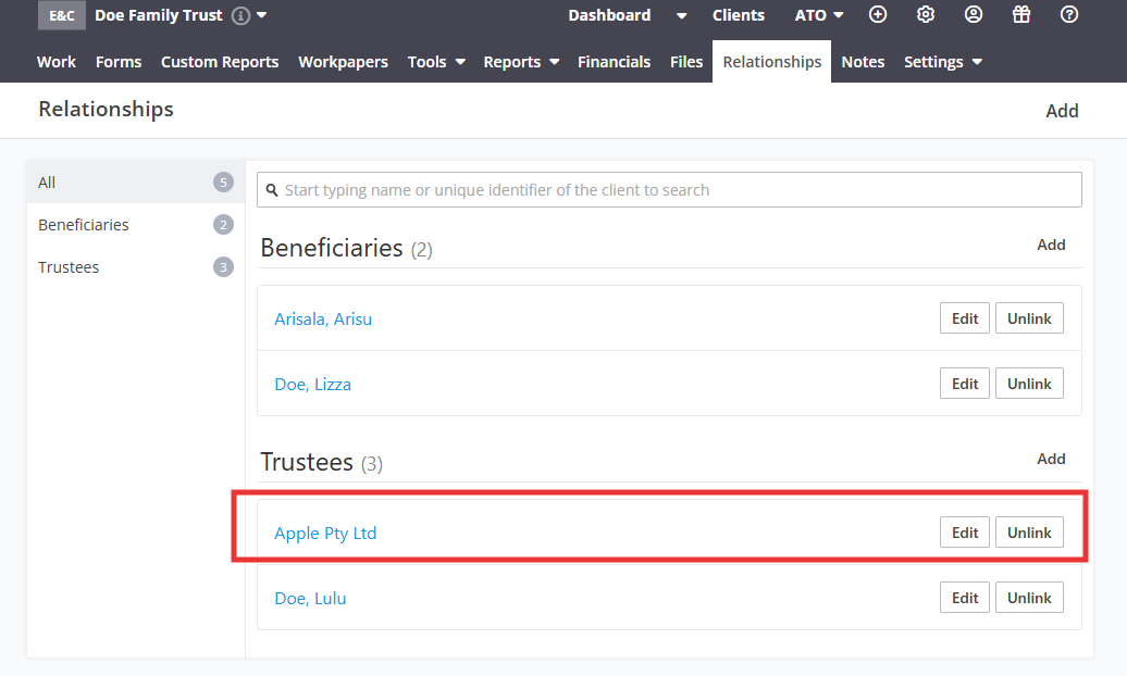 In case when trustee is a company Lodgeit uses director of a company as a signatory. Please add "Director" to the client-company in via Relationships.