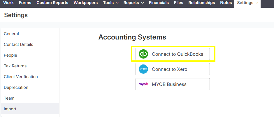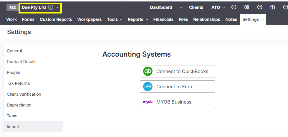 2. After selecting the client ("Doe Pty Ltd" per example above), navigate to client's Settings -->Import.