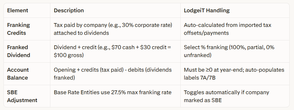 LodgeiT's Share Register and Franking Account tools automate dividend tracking and imputation credits for company tax returns. Franking ensures dividends carry tax credits, avoiding double taxation; balances must stay non-negative per ATO rules.
