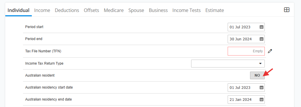 Answer: Make sure "Australian Resident" must be marked as "NO" since the taxpayer is not a resident for the whole financial year. Learn more here