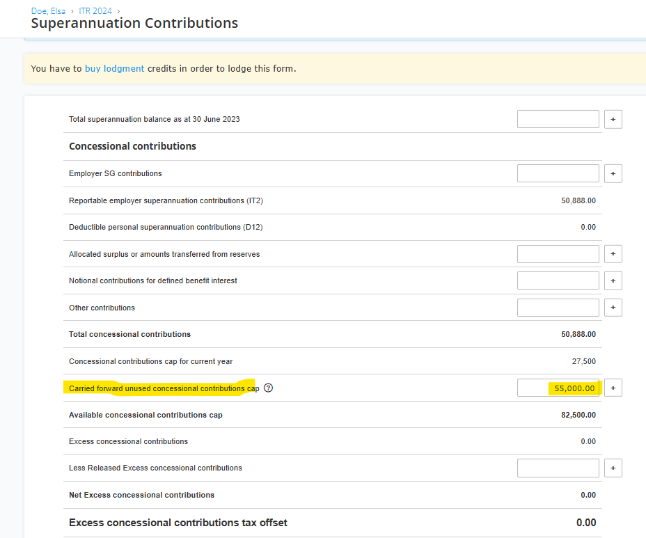 If you have unused concessional contributions cap in the previous latest 5 years, then just click the "Edit" button and input it in the line item "Carried forward unused concessional contributions cap". Example below has only unused cap for 2 previous years (FY 2023 and FY 2022) $27,500 x 2 = $55,000. Here is the related ATO link for your reference: ATO link: https://www.ato.gov.au/individuals-and-families/super-for-individuals-and-families/super/growing-and-keeping-track-of-your-super/caps-limits-and-tax-on-super-contributions/concessional-contributions-cap