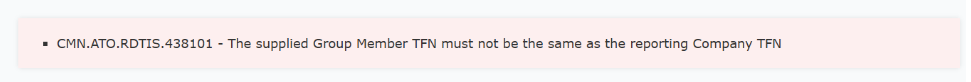 Error: CMN.ATO.RDTIS.438101 - the supplied Group Member "TFN" must not be the same as the reporting Company TFN.