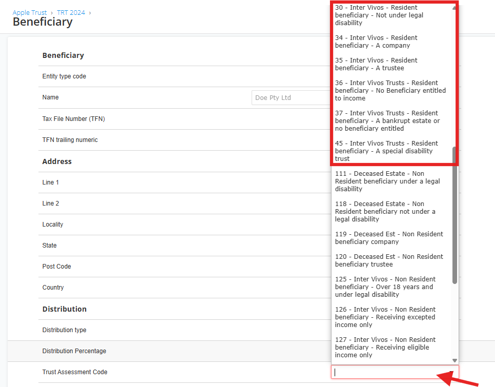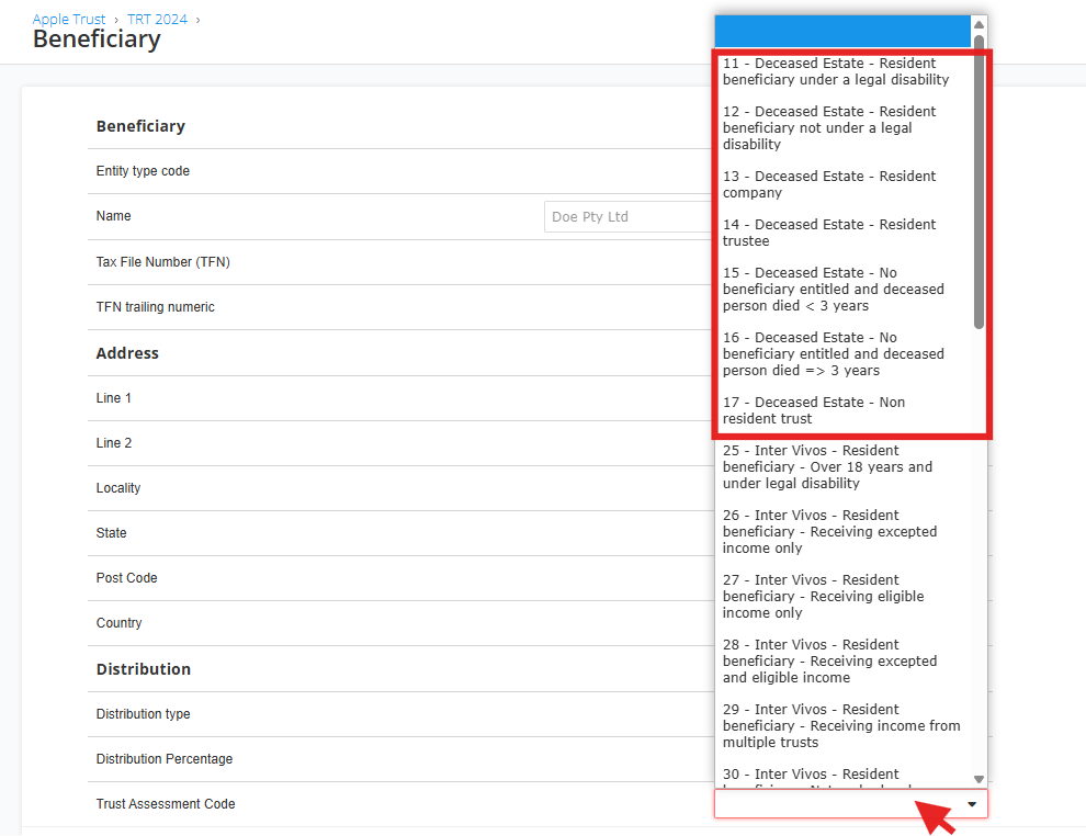 Error: CMN.ATO.TRT.432025 - Assessment Calculation code must be an Inter Vivos Trust estate code. If the Type of trust estate is not a Deceased estate, (code '059) then the Assessment calculation codes in a beneficiary distribution statement must not be a deceased estate code.