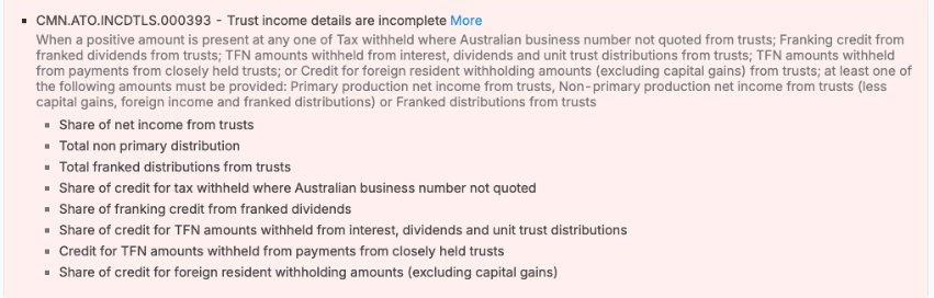 Error: CMN.ATO.INCDTLS.000393 - Trust income details are incomplete.
