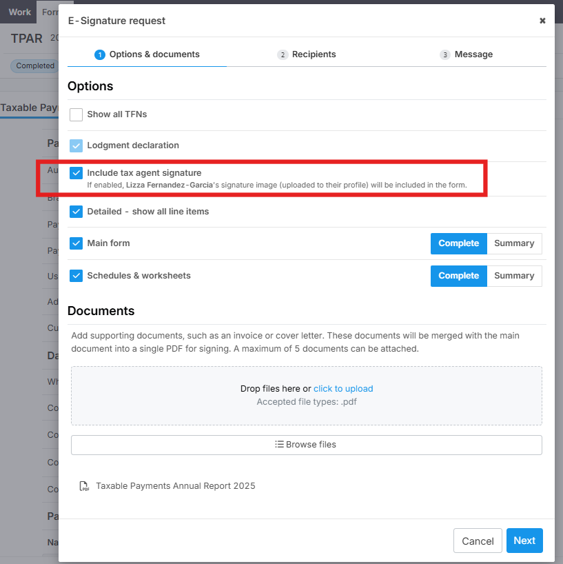 Simply enable this option when sending for e-signature or when printing the tax return.