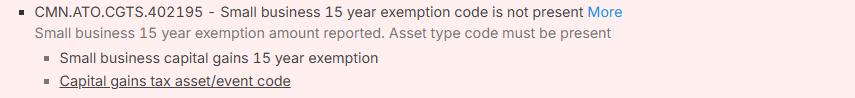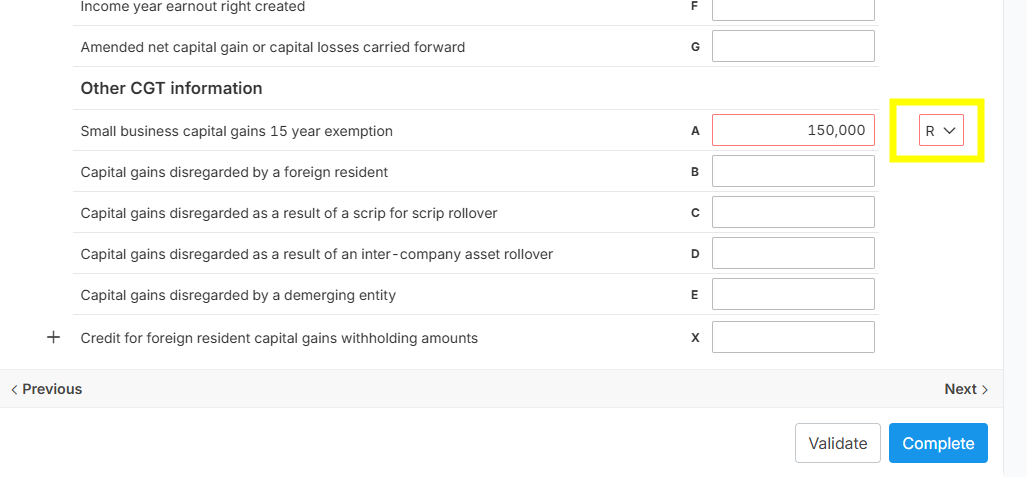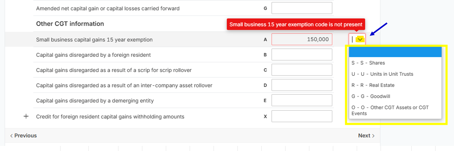 2. Scroll down and look for Item A - Small business capital gains 15 year exemption. Click the dropdown button and select the applicable code and it should resolve the error.