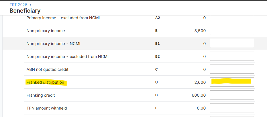 Solution: To resolve the error, you need to go to "Beneficiaries" tab and then open each of the beneficiary worksheets and delete if there is any amount input under Label U - Franked distribution.